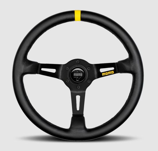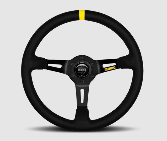 A best seller, the MOMO MOD. 08 racing steering wheel’s size at 350mm in diameter with 88mm of dish allows it to meet the strenuous needs of rally car and saloon car drivers alike. Available in black suede or black leather, the MOD. 08 features anticorodal black anodized aluminum spokes lightened with cutouts. A yellow leather position marker provides quick reference and a true round grip free of anatomical elements delivers maximum flow while driving. A MOMO horn button can be found at the heart of the MOD. 08 giving this race steering wheel some street car safety functionality.